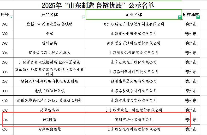 近日,山东省工业和信息化厅正式公布2025年“山东制造 鲁链优品”第一批名单,德州实华化工有限公司的“PVC树脂”成功入选。